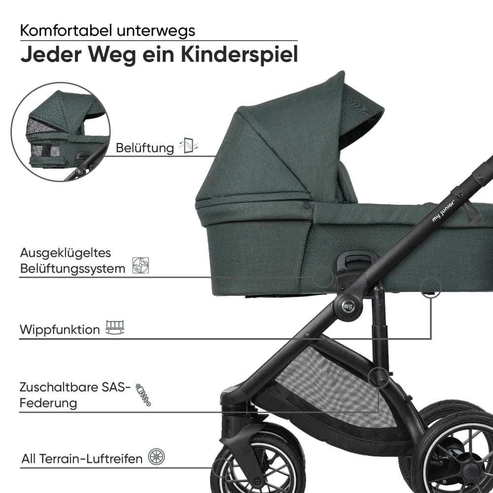Ein Spaziergang im Park, ein Ausflug in den Wald oder ein Trip in die Stadt? Dein my junior VITA unique³ Komfort Kombikinderwagen überzeugt auf jedem Terrain mit einer ausgezeichneten Geländegängigkeit. Der Vita Unique³ ist ein absoluter Outdoor-Fan und begleitet Dich bei all Deinen Abenteuern. Und weil das Leben mit Baby oft unvorhersehbar ist, verfügt Dein my Junior Vita Unique Kinderwagen über einen XXL-Einkaufskorb mit Erweiterungsfunktion, in dem Du alles unterbekommst, was Ihr so braucht.
