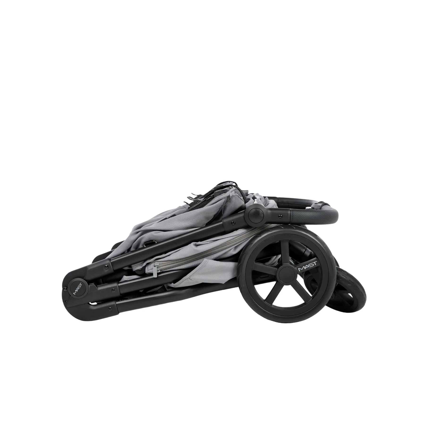 Dank Auto Fold Lock Funktion des Mast Swiss M-Twin X ist der Zwillingskinderwagen im zusammengeklappten Zustand automatisch verriegelt und lässt sich so sicher mittels Transportriemen einfach transportieren.